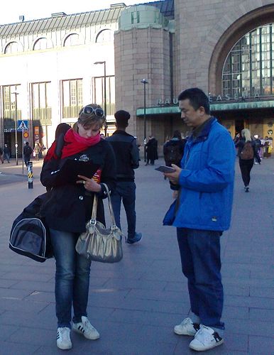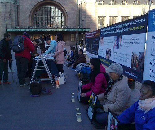 法轮功学员下午在首都赫尔辛基火车站旁举行神圣的烛光守夜,悼念三千多名被中共迫害致死的法轮功学员。期间一批批民众了解法轮功被迫害真相后,踊跃签名反迫害场面感人,有七位学生签名支持反迫害活动后深深地向学员鞠躬,感谢学员为世人做一件维护社会道德的正义之事。