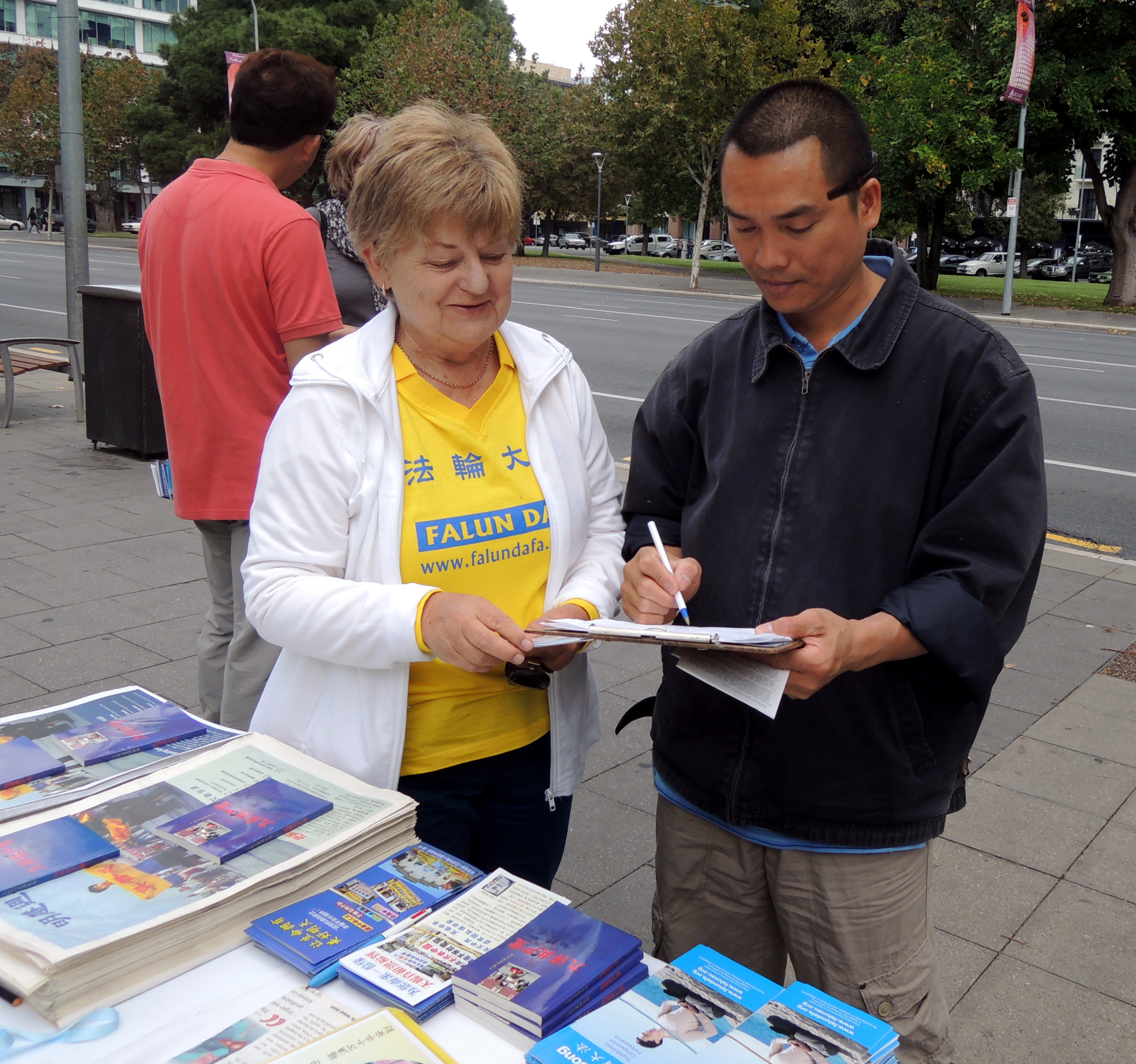 一位西人刚开始对法轮功有误解,受中共谎言宣传影响的他一开始认为中国人太多,需要共产党的暴力统治。随着学员讲真相,他明白了共产党对法轮功的迫害是不合法的,是严重的迫害人权。他随后在征签表上签名反对迫害。