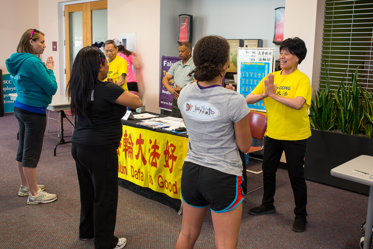 ![]() 圣查尔斯社区大学健康展上,学生们现场学炼法轮功 |
