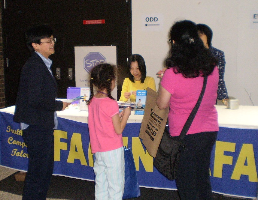 人们接到传单后都表示非常感谢。有个展位上的女士接过介绍法轮大法的单张后,连声说谢谢,并表示:“我去年就见到你了。以后要找你(学功)的。”学员给了她炼功点的联系方式。