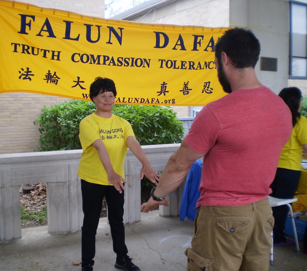 有一位三岁就移民美国的中国小伙子一看到学员的展位就显示出了浓厚的兴趣。他在一所大学里从事免疫学的研究,知道打坐可以提升人体的免疫力,从而增强身体健康。他饶有兴趣地学炼了第一套功法,感觉很好,随后表示以后要来炼功点和学员一起炼功。