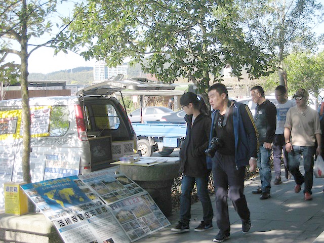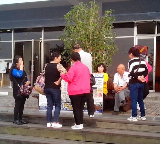 ![]() 大陆游客在休息时观看展板,并与学员(中坐者,穿黄衣服)交谈,了解真相。 |