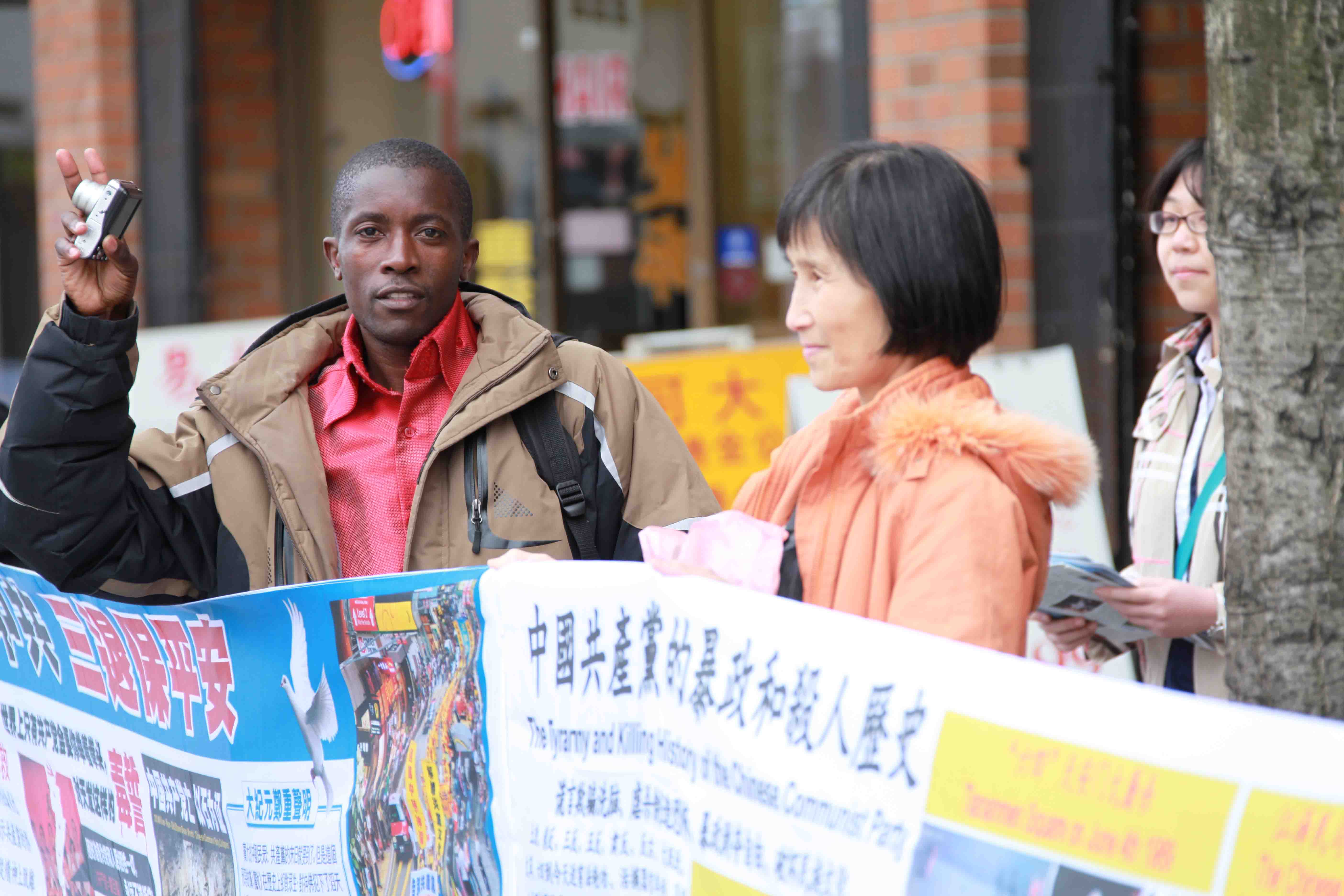 Yasin M Kiraga 先生毕业于加拿大著名大学UBC的政治科学系,他是非洲事务咨询公司、非洲政治传讯网络(Afro Political Communications network )的总裁和首席执行官,他在唐人街看到法轮功学员的反迫害活动后,禁不住停下来,在了解真相后,主动表示要站在法轮功学员的横幅后面留影表示支持并现场发表演讲, 他表示法轮功学员信仰真善忍,受到中共残酷镇压,已经有十五年,对真善忍的镇压是不可接受的。
