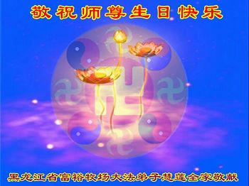 黑龙江省富裕牧场大法弟子全家恭祝师尊生日快乐!黑龙江省七台河市茄子河区全体大法弟子恭贺师尊华诞暨世界法轮大法日黑龙江大法弟子祝师父生日快乐!黑龙江建三江洪河大法弟子恭贺师尊六十三华诞!同庆第十五届世界法轮大法日!法轮大法在全世界洪传二十二周年!感恩伟大师尊的慈悲苦度!洪河大法弟子在此略表寸心,愿以加倍精進做好三件事来回报师尊之万一!黑龙江建三江洪河大法弟子敬上黑龙江省绥化市肇东市全体大法弟子庆祝世界法轮大法日!恭祝师尊生日快乐!我们肇东全体大法弟子感谢师尊慈悲苦度!弟子请师尊放心,弟子们一定会做好三件事,精進不停,完成史前大愿,圆满随师还。