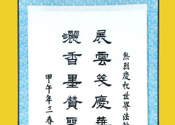 大陆大法弟子为恭贺师尊华诞、庆祝五一三世界法轮大法日、庆祝法轮大法洪传二十二周年而创作的书法作品。上书:“展云笺庆华诞法轮大法日 沥香墨赞圣徒自在飞天时”
