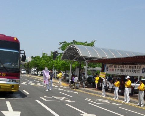 在世界法轮大法日到来之际,二零一四年五月十日,韩国天安市和水源市法轮功学员,来到新开辟不久的退党景点,给中国人讲法轮功真相,劝他们退出中共党、团、队(简称三退)。