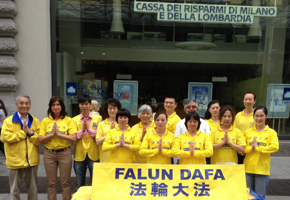 二零一四年五月十日,意大利部份法轮功学员齐聚米兰,庆祝法轮大法弘传世界二十二周年暨师尊华诞。一些法轮功学员在舒缓的音乐中,演示法轮功功法;还有一些法轮功学员面带微笑,向过往民众传递法轮功真相。