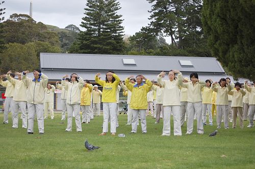 二零一四年五月三日,新西兰法轮功学员在奥克兰著名地标景点---一树山公园集体炼功弘法,庆祝世界法轮大法日。今年五月八日,是法轮功创始人李洪志先生来新西兰传法十五周年纪念日。