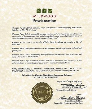 近日,美国密苏里州维尔德伍德市市长和圣查尔斯市市长分别颁发褒奖令,褒奖法轮大法,宣告二零一四年五月十三日为市“法轮大法日”。
