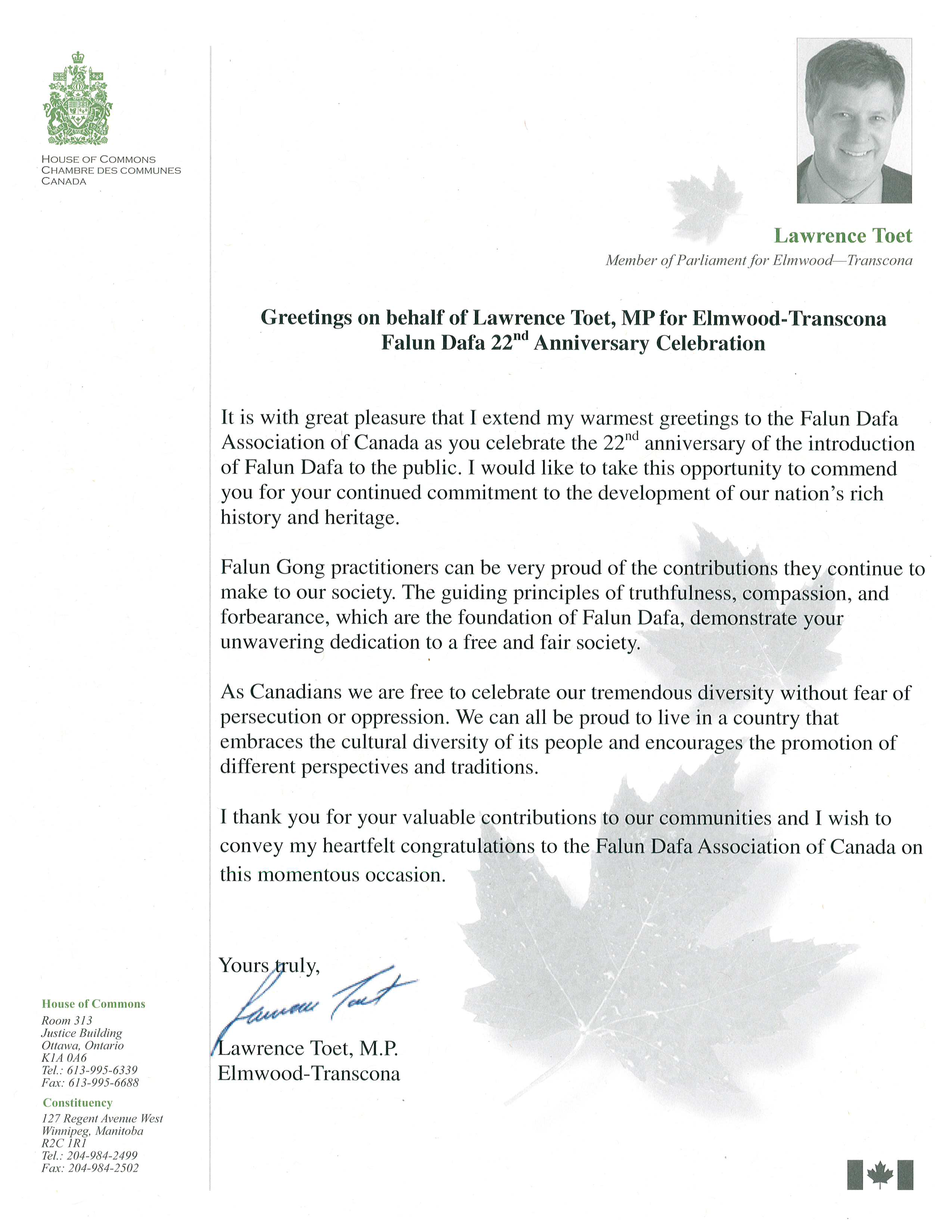 艾姆伍德-畅斯寇那(Elmwood-Transcona)选区国会议员劳伦斯•托伊特(Lawrence Toet)在贺信中说:“在法轮大法弘传于世二十二周年之际,奉上我最衷心的祝贺是我巨大的荣幸,我想借此机会表彰你们为发展我们国家丰富的历史和文化承传做出的持续努力。”