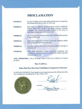 二零一四年五月五日,美国密苏里州州府杰斐逊城(Jefferson City)市长Eric J. Struemph颁发褒奖令,褒奖法轮大法,宣告二零一四年五月十三日为“颂赞真善忍的法轮大法日”。