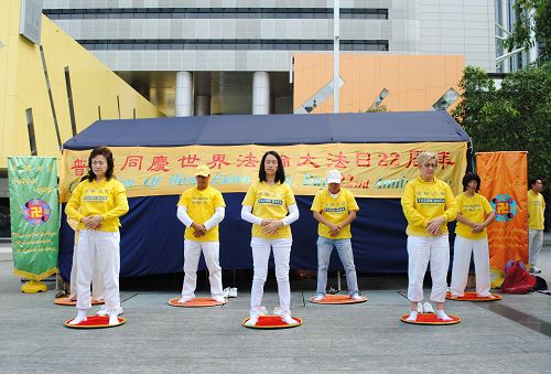 五月十一日上午,台湾花莲法轮大法学员在美仑山公园集体炼功、学法、讲真相,恭祝伟大的师尊生日快乐,庆祝即将到来的世界法轮大法日。