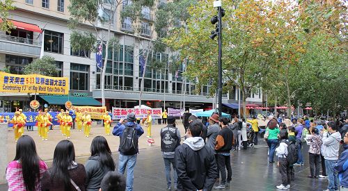 二零一四年五月十日下午,澳大利亚墨尔本部分法轮功学员在市中心城市广场(City Square)举行了庆祝活动,恭贺法轮大法创始人李洪志大师华诞暨世界法轮大法日,庆祝大法弘传世界二十二周年。