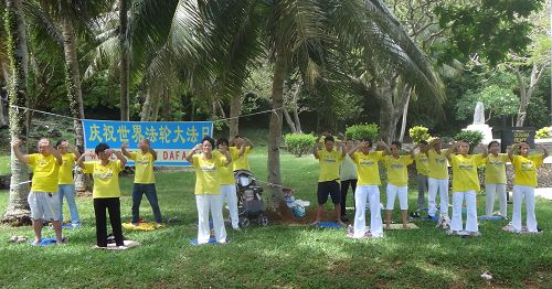塞班岛法轮大法修炼者于五月十一日以景点炼功、讲真相方式庆祝世界法轮大法日,感谢师尊对世人的慈悲苦度。