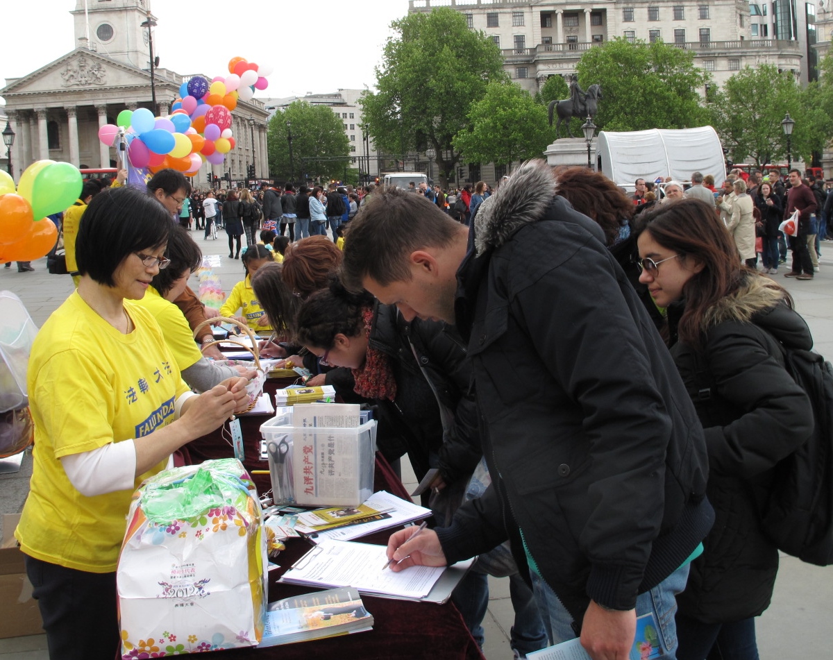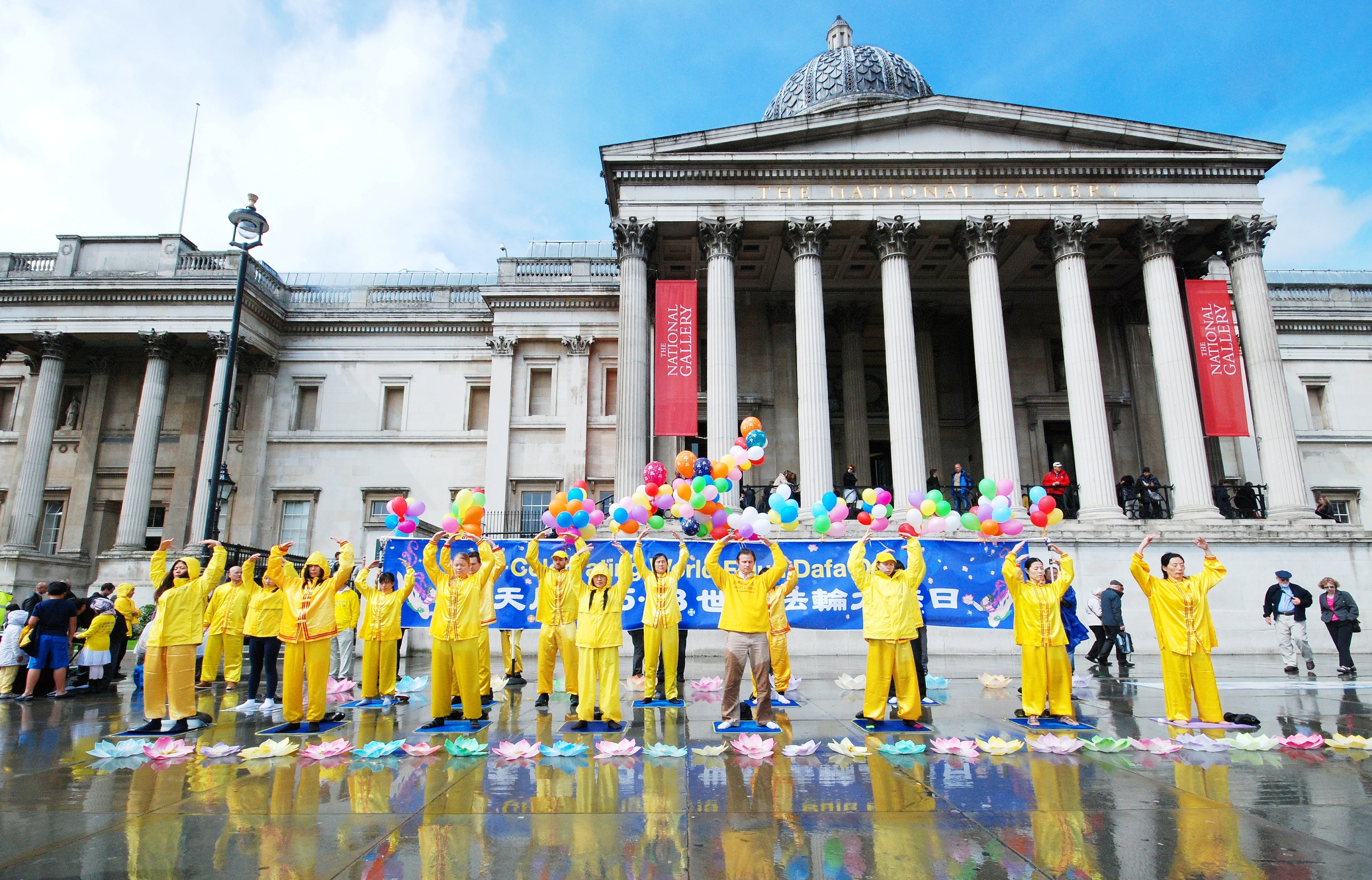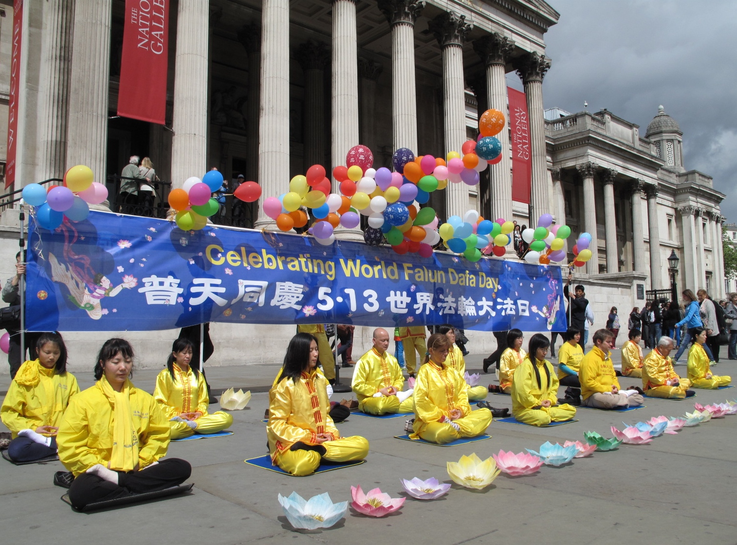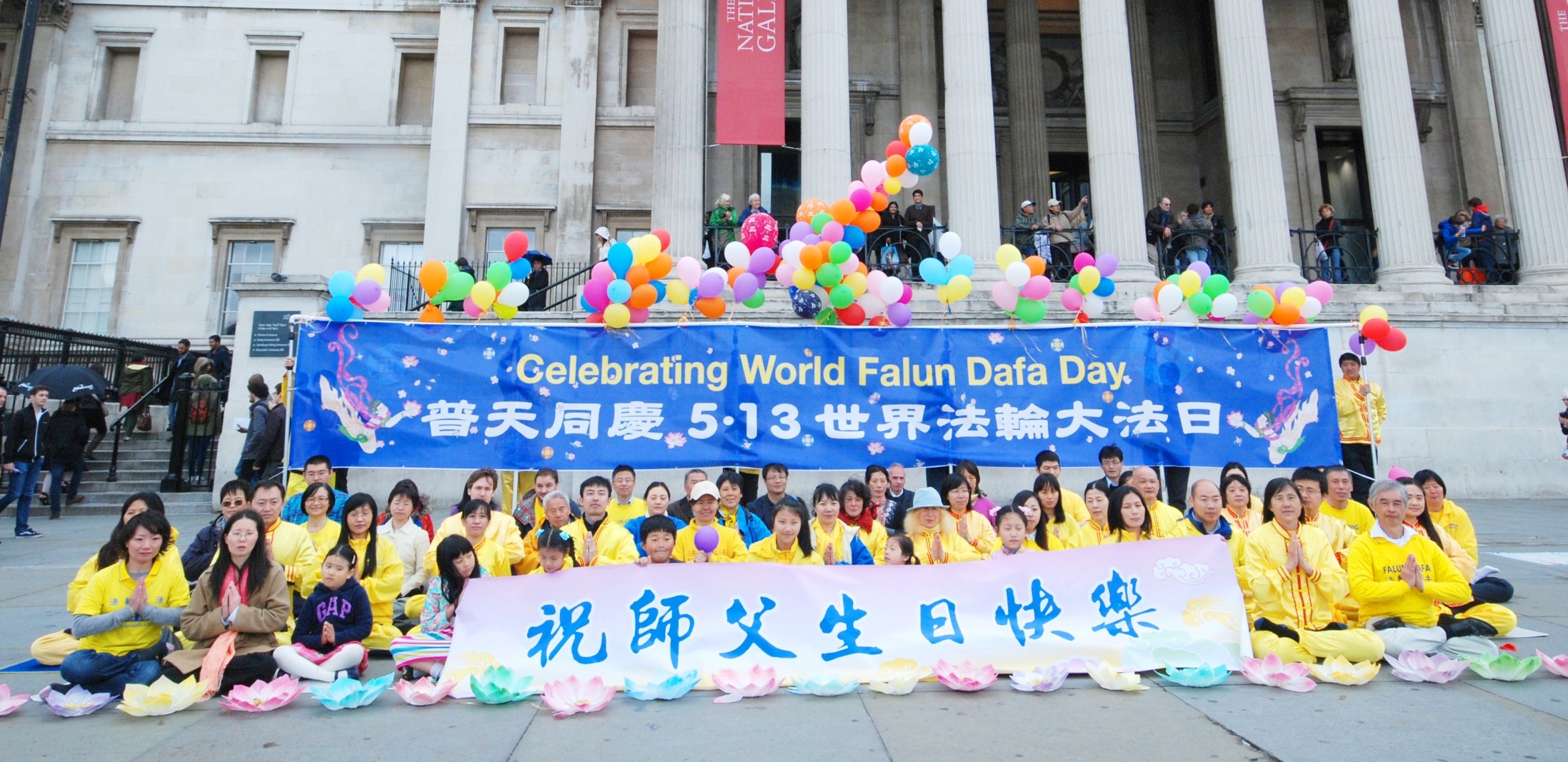 ![]() 二零一四年五月十日,法轮功学员在伦敦鸽子广场庆祝即将来临的世界法轮大法日 |