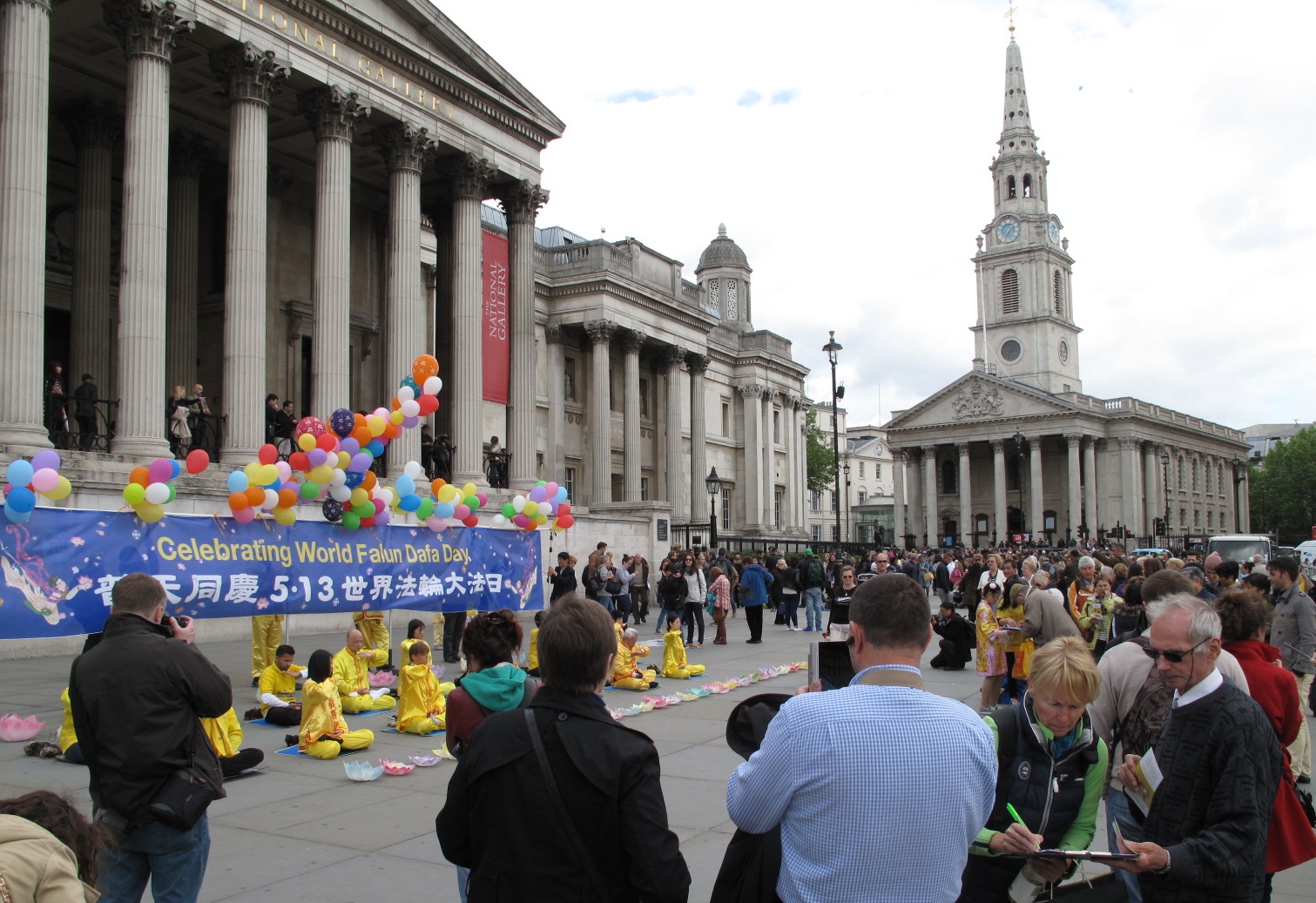 著名的鸽子广场位于伦敦市中心,是国际游客必到的伦敦地标之一,五月十日来到这个旅游胜地的人们幸运地赶上了旅游手册上看不到的特殊风景:法轮功学员以集体炼功和讲真相的方式庆祝即将来临的第十五届世界法轮大法日,并向李洪志师父表达感恩。