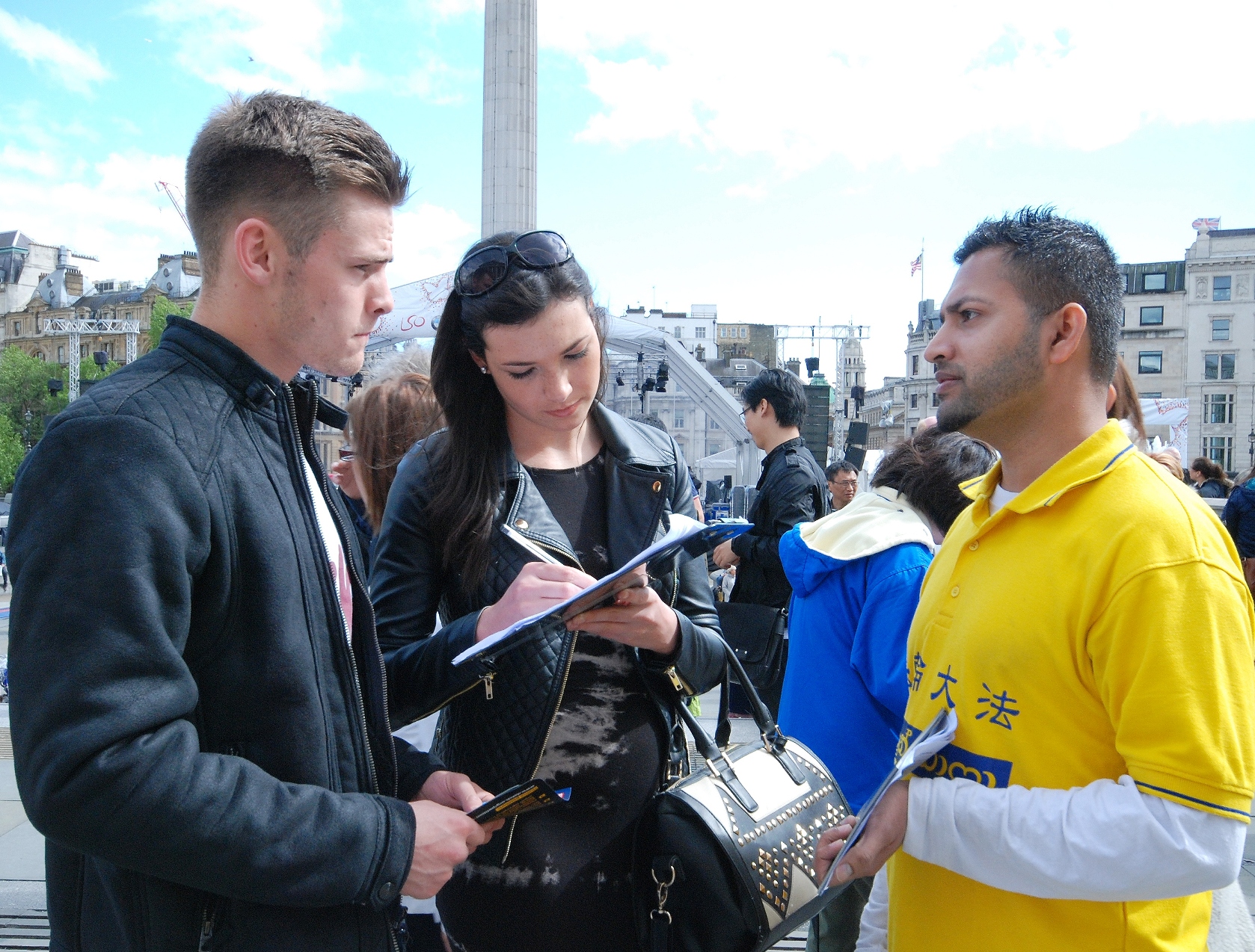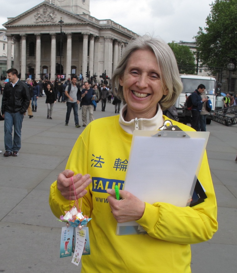 家住伦敦的阿莱克森(Alexon)女士周六下午恰巧途径鸽子广场,第一次看到法轮功的她立即被世界法轮大法日的庆典活动所吸引。停留良久,她长时间注视着展示功法的法轮功学员,似乎不愿挪开目光,她还在反对中共活摘法轮功学员器官的征签表上签了字。