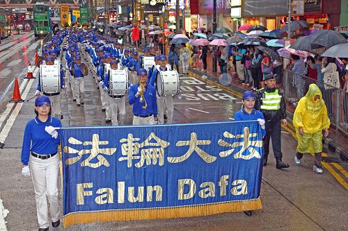 下午两点半法轮功学员由北角英皇道游乐场出发展开游行,浩浩荡荡的游行队伍在天国乐团奏起“送宝”、“法正乾坤”、“法轮大法好”、“谢谢师父”等壮阔威武的乐声引领下,沿着港岛区闹市游行到中环的遮打花园。