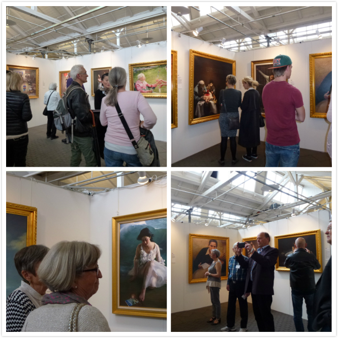 五月九日下午,艺术展隆重开幕。这次艺术展有近二百位来自十个国家的艺术家参展,是北欧最大的艺术展。“真善忍”国际美展成为这次艺术展中最抢眼,最受人关注的亮点。展出的画作采用传统写实手法,反映法轮功修炼者的精神世界,以及反迫害为主题,作品包括油画、水彩画、中国画以及雕塑等作品。画展所表现的深刻内涵与精湛的技艺令中西方观众震撼。有观众表示,我们看到这些画,真的看到了希望;一位丹麦观众握着法轮功学员的手说:“你们做了一件非常伟大的事,画展中传递出的能量非常强,纯正和美好,这种纯正将改变世界。”