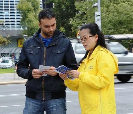 南澳大学国际贸易学生佳斯敏•莎莉平时喜欢打坐,崇尚自然。她偶然路过,被法轮功学员炼功场面所吸引。她感觉特别震撼。“我只是路过,我感受到了巨大的能量,非常美好,我也想学。我有时也冥想打坐,我是很灵性的人,我自然就被(功法)吸引了。当我知道了正在中国发生的(迫害法轮功)的惨绝人寰的消息,我非常伤心。每个人都应该有精神信仰的自由,都应该把宇宙和我们自身联系起来,而不是被强迫剥夺这种权利。”莎莉很高兴地接受了法轮功学员提供的资料和联系方式,表示会进一步了解和学习。