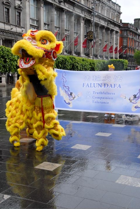 ![]() 图说:法轮功学员在庆祝活动中舞狮 |