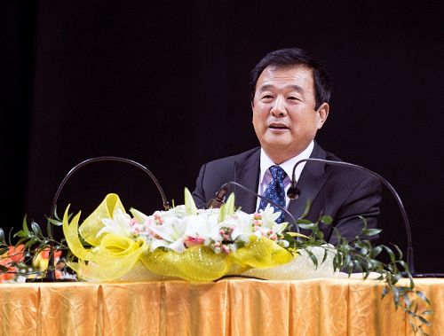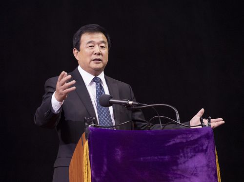 法轮功创始人李洪志先生莅临会场,全体与会者恭敬起立,报以热烈掌声。李洪志师父为大法弟子讲法约一小时四十多分钟。