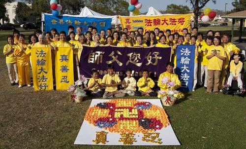 法轮功学员们还用五百多朵纸折的彩色莲花排列成法轮图形和“真善忍”字样。学员们身着金黄色的炼功服,手举绣着“师父您好”的紫色丝绒布,在法轮图形前合影,向李洪志师父表达感恩。