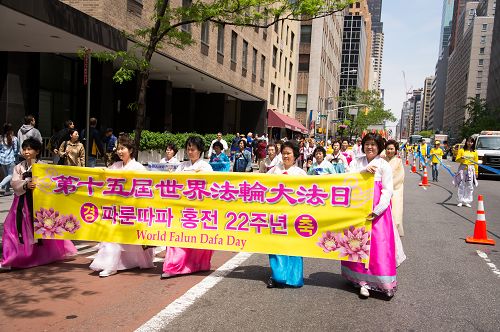 【明慧网二零一四年五月十五日】(明慧记者章韵、兰铃纽约报道)二零一四年五月十四日,来自五十多个国家二百多个地区的数千名法轮功学员,汇聚在纽约曼哈顿联合国公园(Dag Hammarskjold Plaza)举行大型集会游行,庆祝世界法轮大法日,暨大法弘传世界二十二周年,告诉各界民众法轮大法的美好,同时揭露中共邪党血腥迫害法轮功学员的罪恶,并呼吁解体中共,制止迫害。