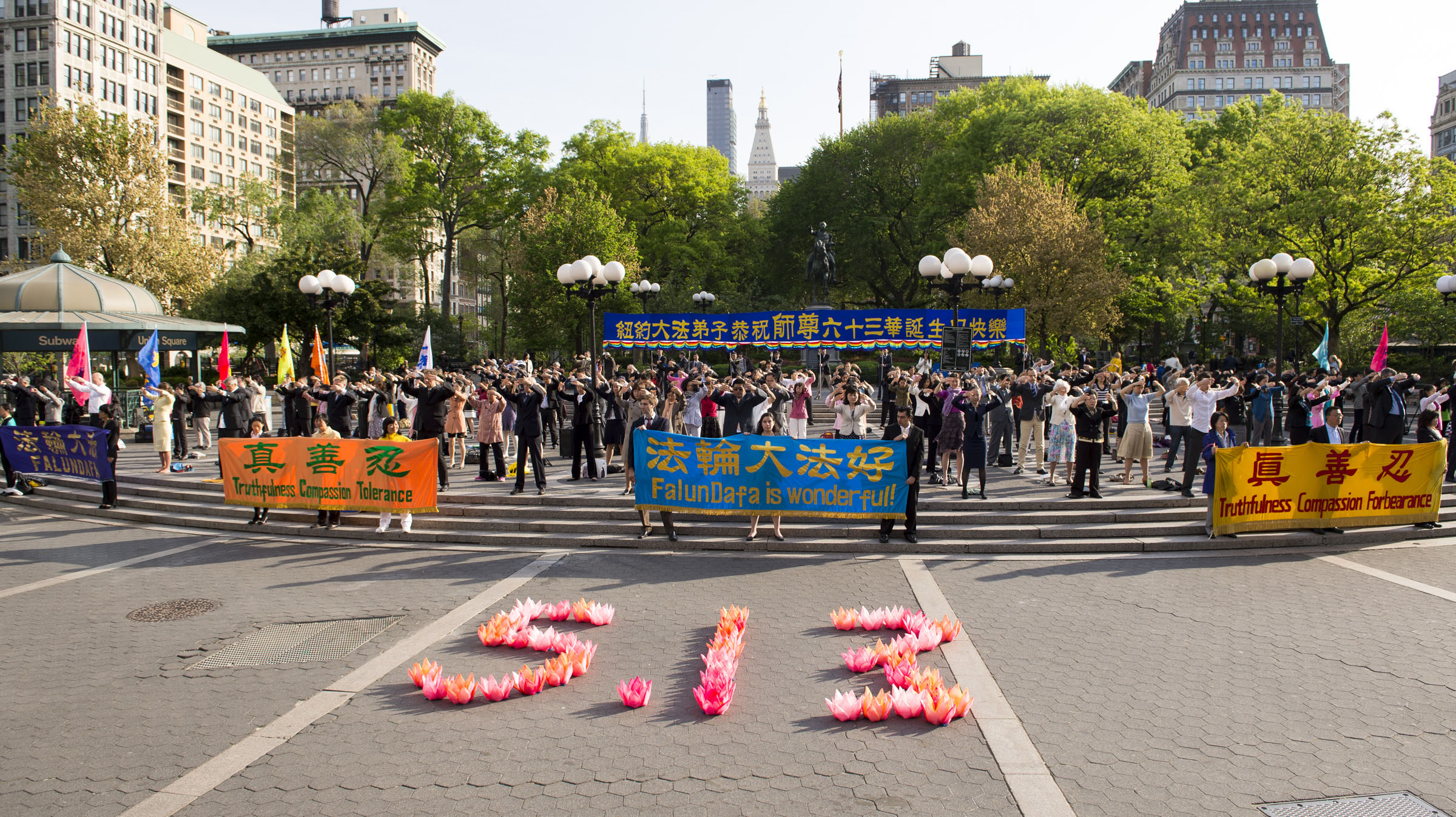 【明慧网二零一四年五月十六日】(明慧记者华清、兰铃纽约采访报道)二零一四年五月十五日下午一点半,部分来自世界各国的法轮大法学员聚集在纽约的联合广场(Union Square )搭起舞台,以歌舞表演,庆祝大法弘传二十二周年,表达对李洪志师父的感恩,并将“真、善、忍”的美好传播给世人。