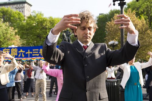 【明慧网二零一四年五月十六日】(明慧记者采菊、华清纽约报道)二零一四年五月十三日早晨,部份从世界各地前来纽约参加“庆祝第十五届世界大法日”系列活动的法轮功学员,来到曼哈顿下城的联合广场晨炼。