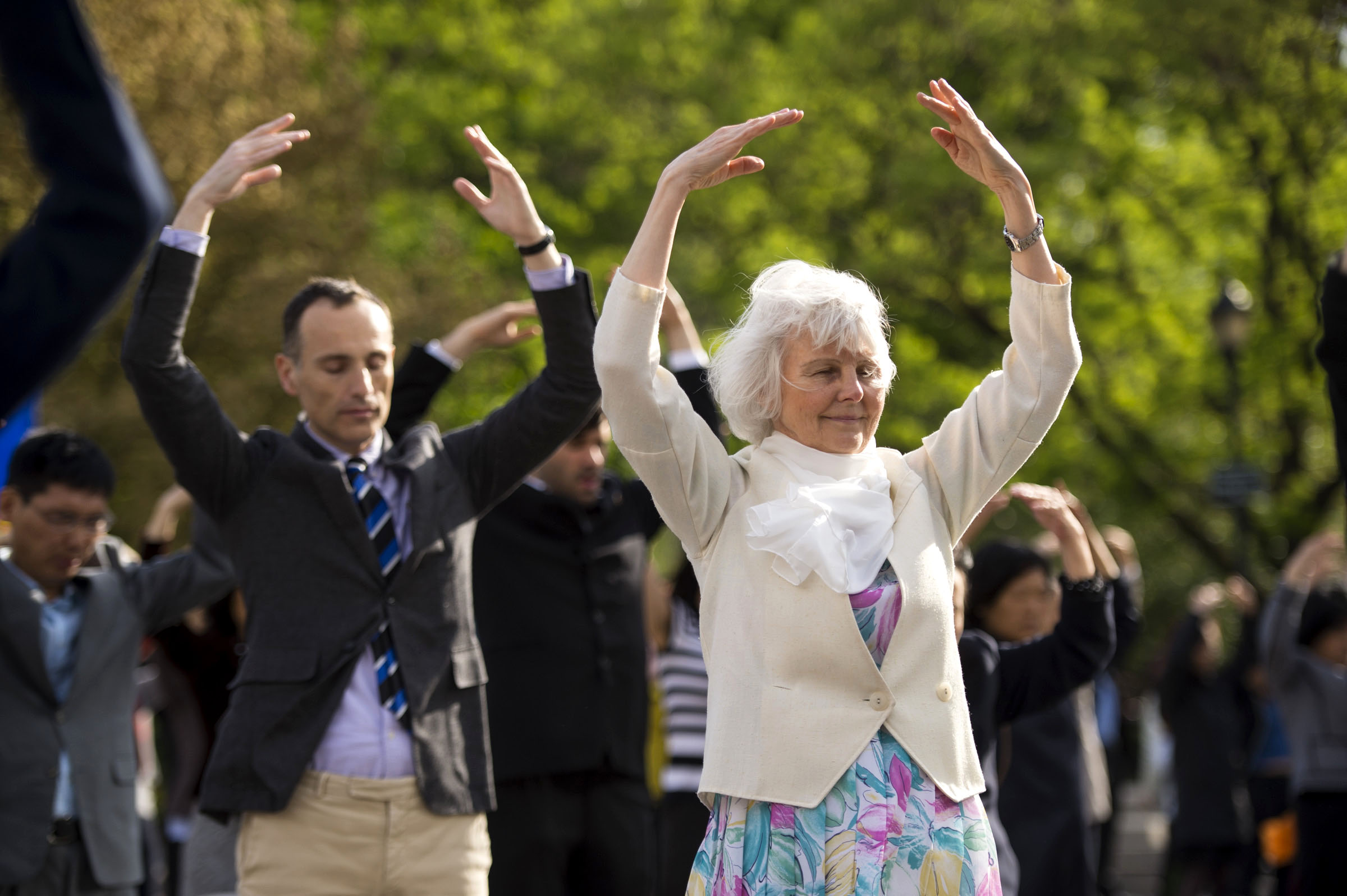 ![]() 二零一四年五月十五日,来自瑞典的卡罗尔•考莱尔(Carole Caulier,前排右)女士在纽约时代广场炼功。 |