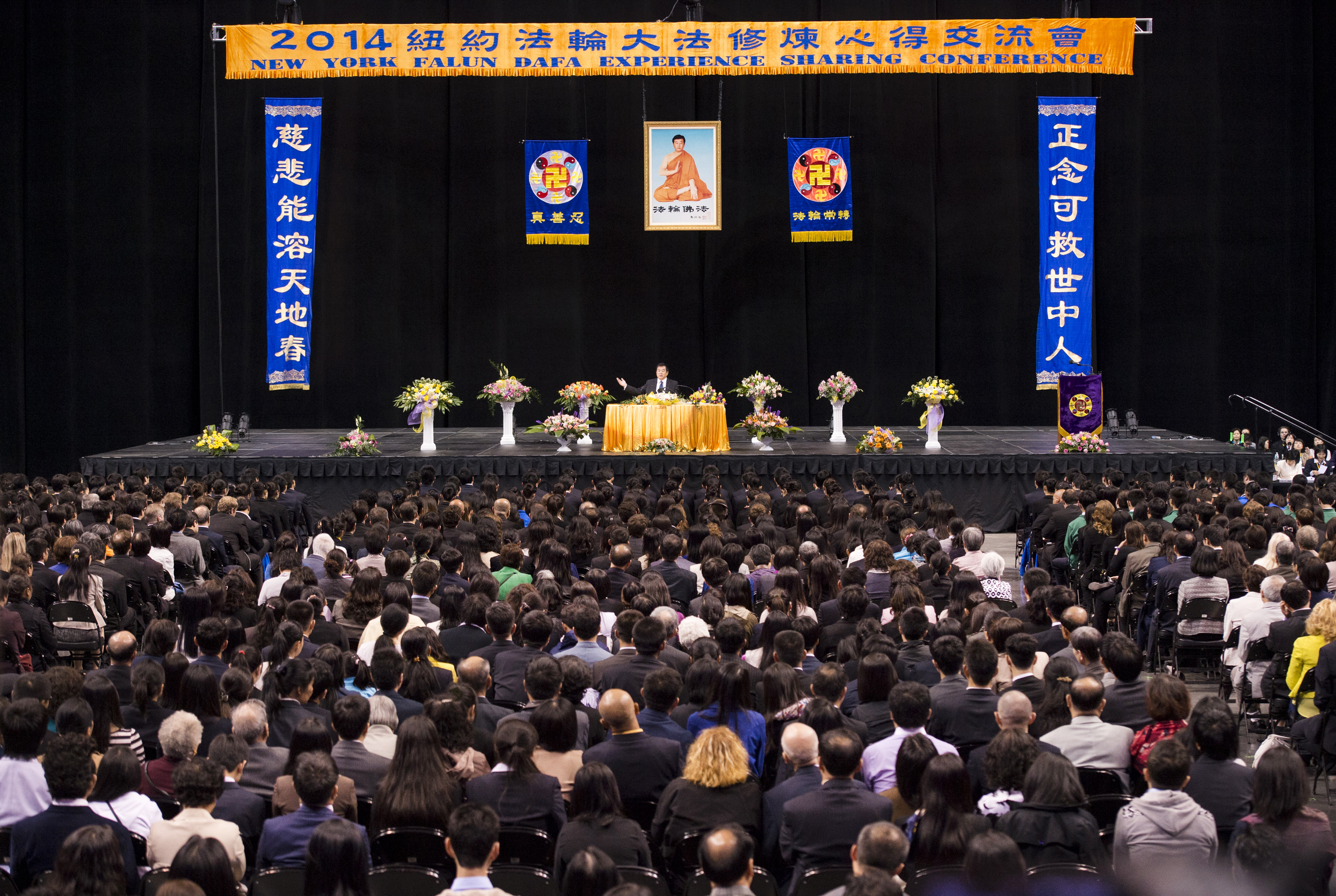 巴克里中心(Barclays Center)是纽约布鲁克林篮网队主场比赛场馆,这座造价十亿美元的新颖宏伟的建筑被The Verge称为“来自未来的体育馆”。巴克里中心的独特之处就是入口波浪形的360°LED 屏幕。法会当天,LED大屏幕上清晰地显示中英文“二零一四纽约法轮大法修炼心得交流会”的字样。在会场中心,居于场中间的回放HD LED 屏幕,让每个角落的座位都能清晰地看到台上的发言。四周的环绕LED 屏上显示着李洪志大师《洪吟》里的诗句, 整个现场庄严、神圣。