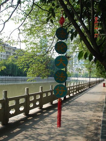 “5.13”世界法轮大法日期间,贵阳市中心的“法轮大法好”“真、善、忍好”条幅