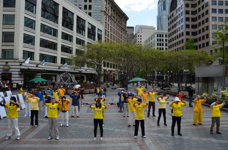 【明慧网二零一四年五月二十一日】二零一四年五月十一日,美国西雅图法轮功学员在市中心的西湖公园举行了“五一三法轮大法日”活动,庆祝法轮大法弘传世界二十二周年。