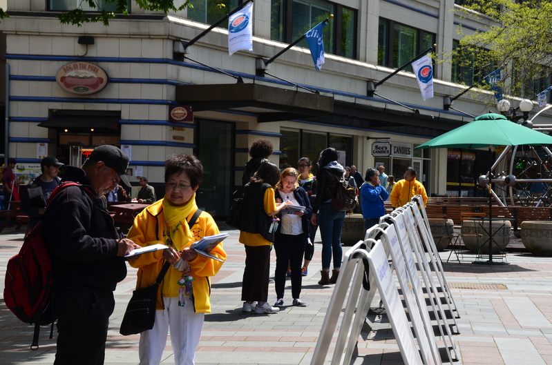 还有一位退休前在西雅图市政府工作的Dennise先生,虽然他已经了解了法轮功,但是,他表示真相展板和学员的亲身经历依旧非常吸引他。他说: “我从未见过象你们这样安静平和的示威者。非常感谢你们能够这么多年一直坚持着,并为你们在中国的朋友和境遇发声,令人钦佩!”他建议法轮大法学员应该定期、主动去找各级政府讲法轮功在中国遭迫害的真相。他还表示:“我一直很反对拿人权做交易,也反对中国通过贸易合作、经济利益封口美国。”