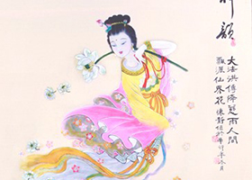 这幅作品名字叫《神韵》,听同修说作者当时画这幅画的时候没有画那么多花和仙女的头饰。5•13世界法轮大法日临近时,画中的仙女与作者進行了沟通,仙女说:5•13快到了,你不给我装扮装扮吗?