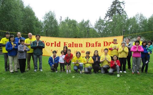 二零一四年五月十一日,美国大波特兰地区法轮功学员聚集在比弗顿图书馆前集体炼功,庆祝世界法轮大法日,同时向当地民众提供资讯,介绍法轮大法,揭露中共对法轮大法修炼者长达十五年的残酷迫害。