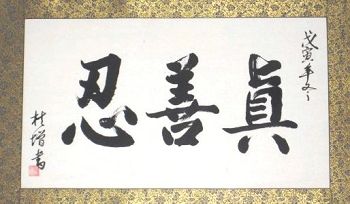 明真相的大法弟子家属为庆祝五一三世界法轮大法日、庆祝法轮大法洪传二十二周年所书的书法作品。