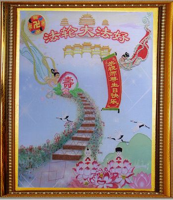 规格 160cm×135cm 材料 丝线 布乘天梯法轮大法传 擎天神梯降祥云绕贺联 佛光映满堂仙娥翩起舞 净莲嫣然放登高莫踟蹰 回归皆有望乘天梯大法传 天梯降佛恩倾 法船行度众生 佛光映亿帆扬 净莲升去人心 转观念救众生 兑誓约走正路 登天梯守正念 了洪愿我们全家人自从修炼法轮大法,便无时无刻的感受到了大法的美好。