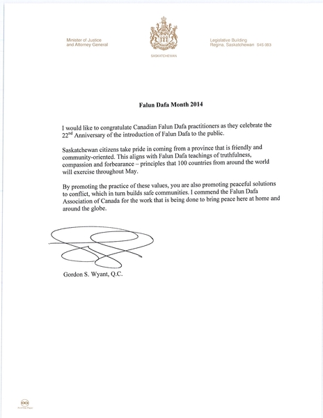 萨省(Saskatchewan)司法厅长怀恩特(Gordon S. Wyant)在贺信中说,在加拿大法轮大法学员庆祝法轮大法传世二十二周年之际,他要献上诚挚的祝贺。