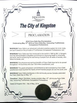 五月十三日世界法轮大法日前夕,加拿大安大略省金斯敦市宣布二零一四年五月十三日为“法轮大法日”。金斯敦市已连续六年褒奖法轮大法日,颂扬“真善忍”的原则。