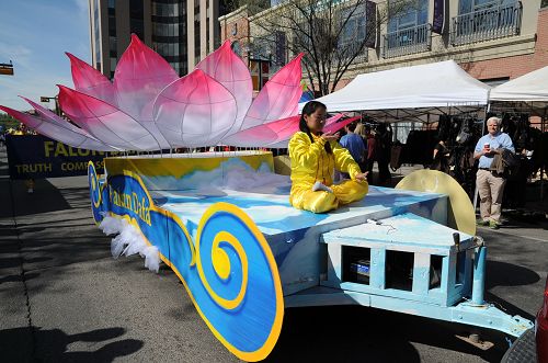 二零一四年五月二十五日,在加拿大卡尔加里市中心,近十万市民庆祝一年一度的丁香节。卡尔加里市的法轮功学员和往年一样,参加了丁香节开幕式游行,并在节日上广传法轮大法的美好。