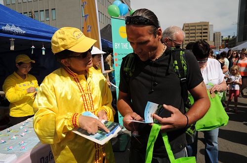 游行之后,法轮功学员在展位上进行功法演示,向游客发放大法宣传资料,并帮助华人做“三退”(退出邪党及团、队组织)。人们纷纷驻足,有的取阅法轮大法的介绍材料,有的询问学功的途径和方法。当许多人得知法轮功对身心健康有奇效,并且法轮功免费义务教功,可以每周上午在王子岛公园入口处学习,甚至可以自己在网上阅读自学时,都非常高兴。还有人询问法轮功和太极、瑜伽有什么关系。