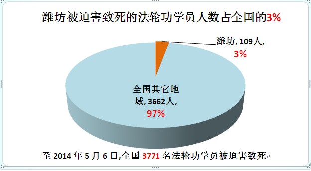 十五年来,中共迫害致死法轮功学员,目前通过民间渠道已证实的至少3771人(因为中共封锁,这个数字仅仅是实际迫害致死数字的冰山一角)。其中山东省潍坊市一百零九人,迫害致死人数居全国地级市之首。