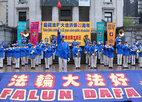 二零一四年五月四日,加拿大温哥华法轮功学员在温哥华市中心的艺术馆外举行庆祝活动,庆祝即将到来的“世界法轮大法日”,庆祝法轮大法传世二十二周年。