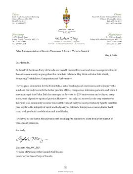 加拿大绿党领袖、国会议员伊丽莎白•梅(Elizabeth May)二零一四年五月一日致信大温哥华及大维多利亚-沙尼治区法轮大法学会,祝贺法轮大法月。