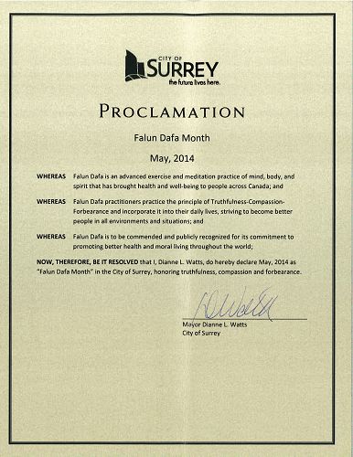 四月至五月初,加拿大卑诗省素里市、基隆拿市、潘提克顿市和圣约翰堡市的市长分别向加拿大法轮大法学会颁发褒奖,宣布二零一四年五月为“法轮大法月—颂扬真、善、忍”。