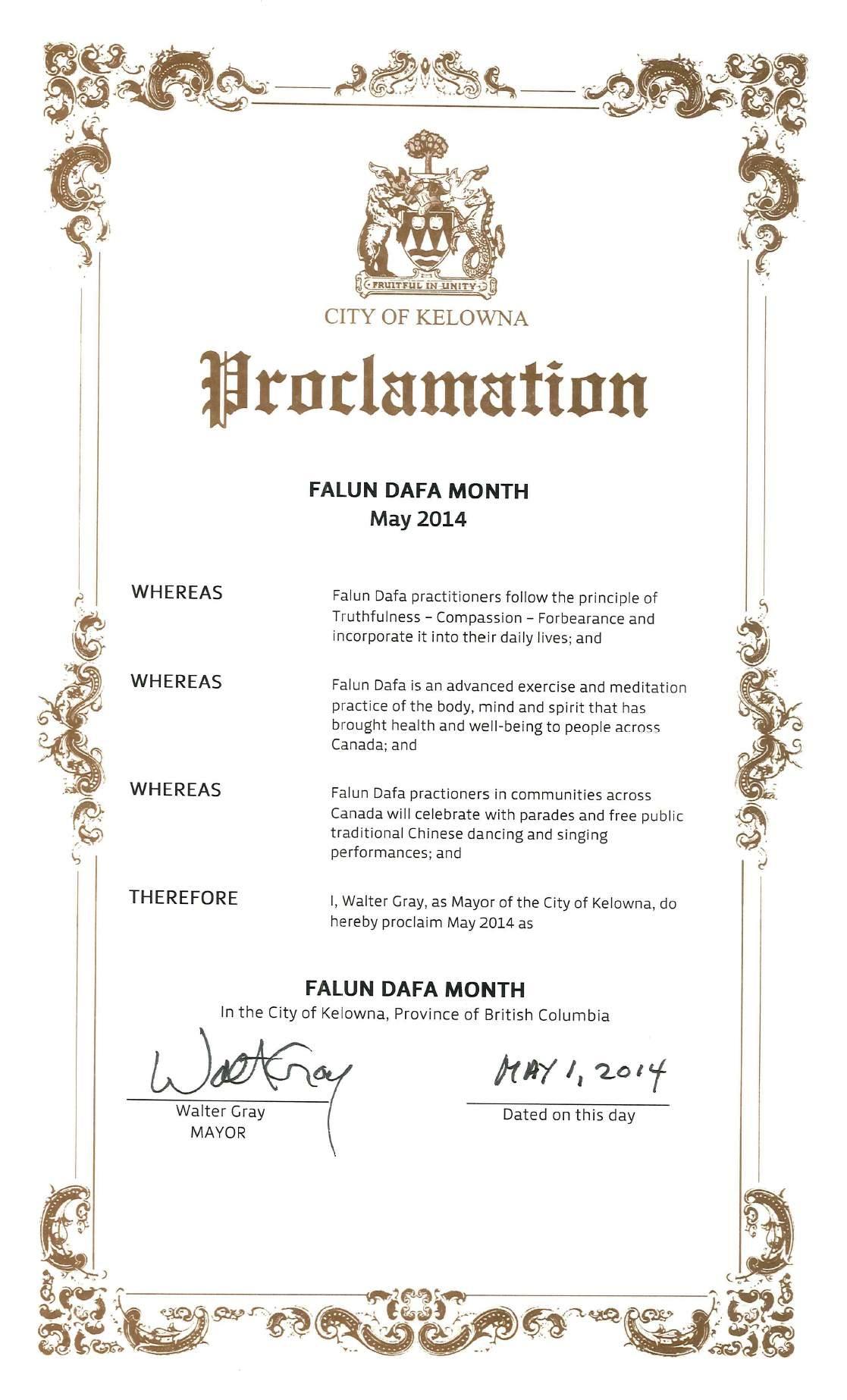 二零一四年五月一日,加拿大卑诗省(British Columbia)基隆拿市(Kelowna)市长宣布五月为“法轮大法月”。