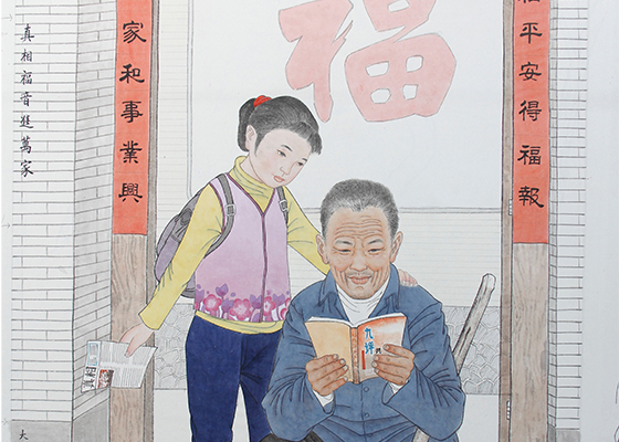 河北大法弟子为恭贺师尊华诞暨法轮大法洪传二十二周年而创作的绘画。画中对联为:做好人家和事业兴 明真相平安得福报,横批:天赐洪福。