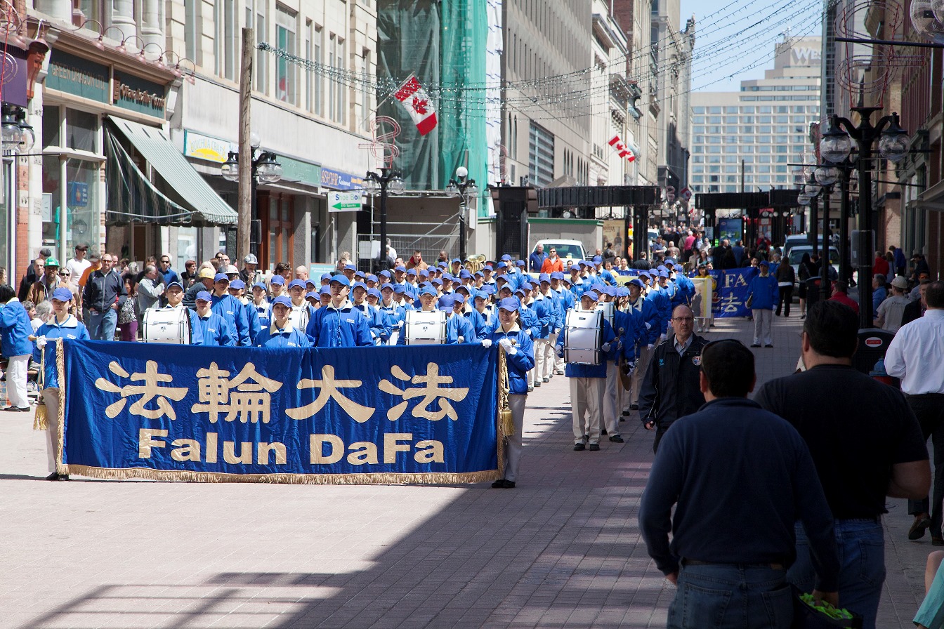 二零一四年五月七日,来自加拿大渥太华、蒙特利尔、魁北克、多伦多等地的法轮功学员,汇聚加拿大首都国会山前,以天国乐团遊行、集体炼功、腰鼓队、歌舞等形式,庆祝法轮大法弘传世界二十二周年。